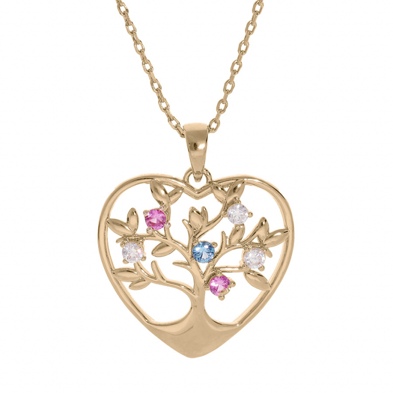 Collier Arbre de Vie en Plaqué Or 18K avec 6 oxydes de zirconium blancs, roses et bleus.